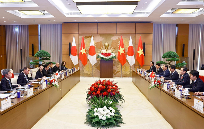 Председатель НС высоко оценил и поблагодарил Японию за её ценную поддержку и сотрудничество в законодательной сфере, а также за предоставление Вьетнаму официальной помощи в целях развития (ОПР) и прямых иностранных инвестиций (ПИИ), способствующих экономическому и социальному развитию страны. Он призвал к дальнейшему укреплению экономических связей, содействию вьетнамским предприятиям в интеграции в глобальные цепочки поставок, а также поощрению японских инвестиций в такие направления, как высокотехнологичное сельское хозяйство, возобновляемая энергетика и развитие инфраструктуры. Кроме того, он предложил расширить программы качественной подготовки кадров, обмен студентов и трудовых ресурсов, что будет способствовать решению проблемы старения населения в Японии и повышению профессиональной подготовки кадров во Вьетнаме.