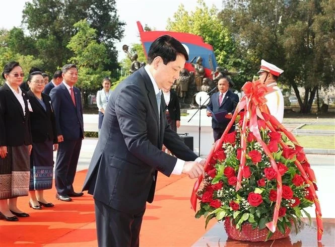 Президент Лыонг Кыонг и вьетнамская делегация возлагают венок к памятнику лаосским героям и павшим бойцам во Вьентьяне. (Фото: ВИA)